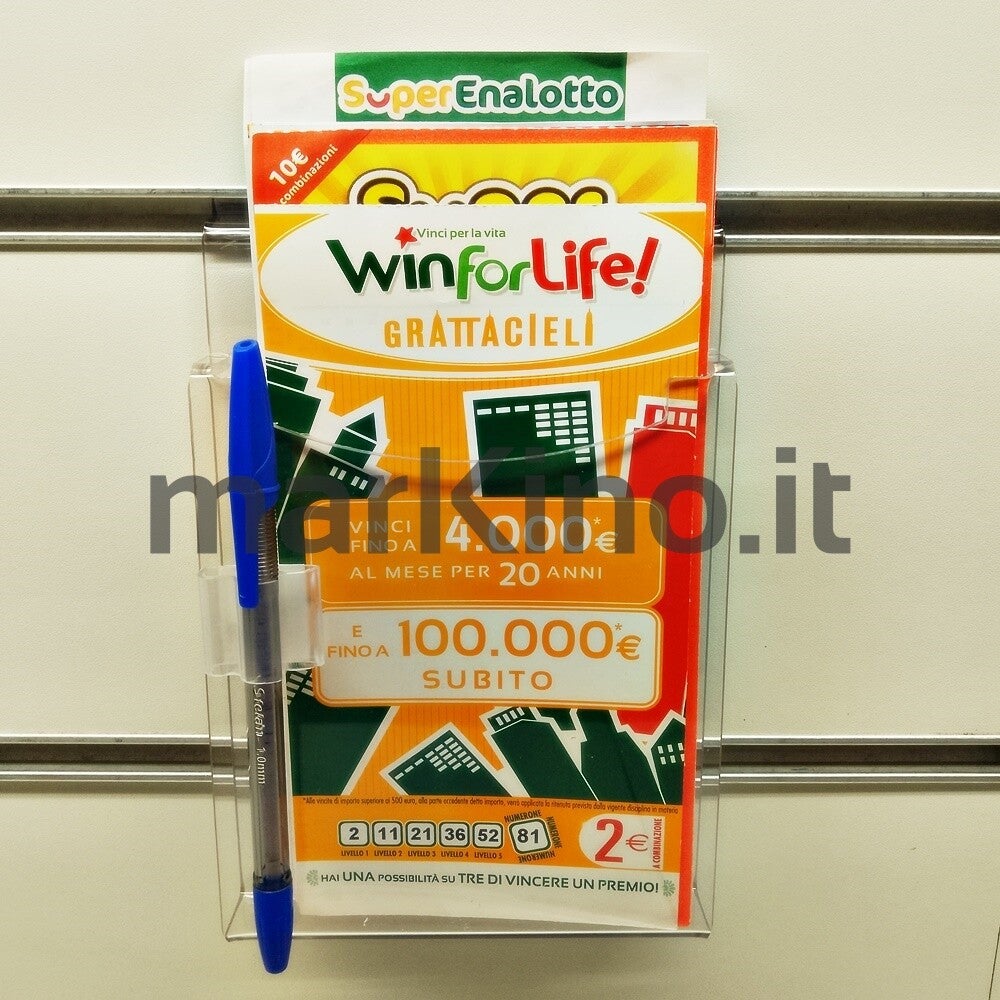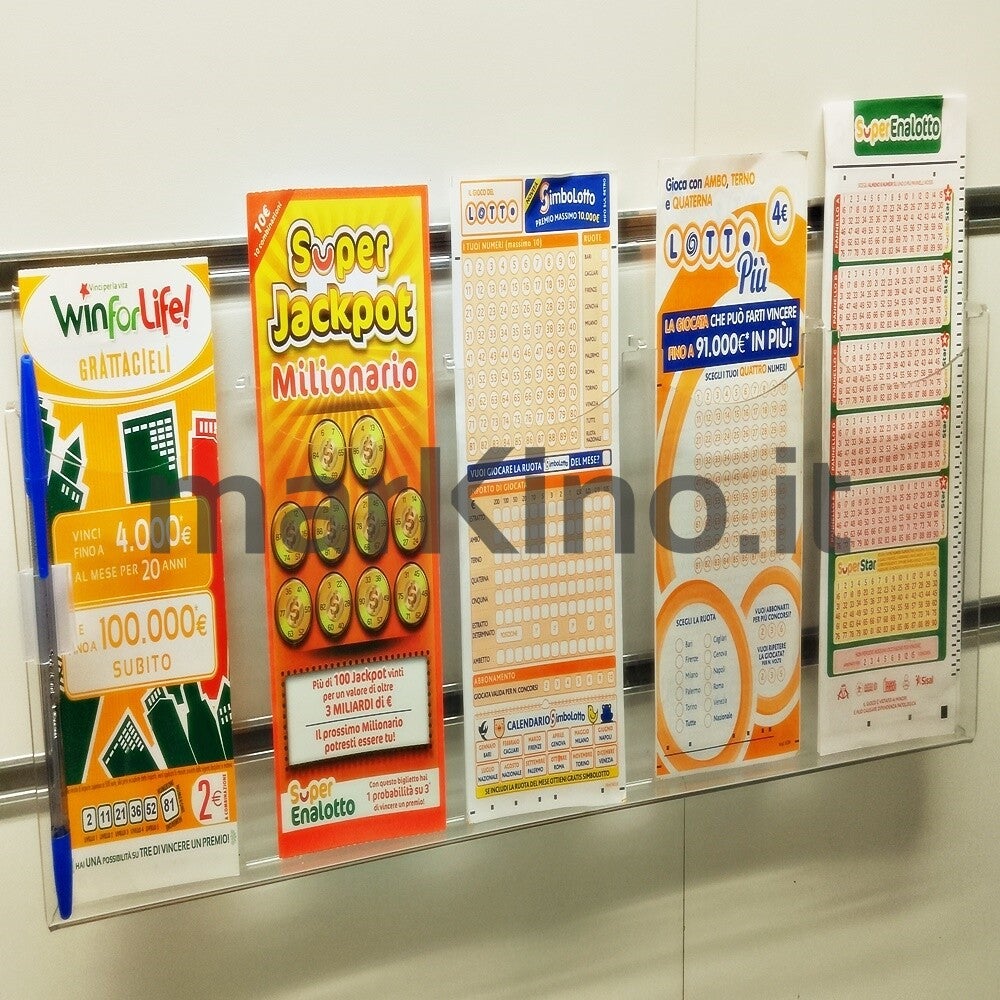 Soluzione salvaspazio per la vostra tabaccheria o ricevitoria. Il pannello espositore per schedine e lotterie si appende al pannello dogato con inserto in alluminio. Tre le misure disponibili. Seleziona quella più adatta alle tue esigenze. Il pannello display è disponibile anche senza aggancio per pannello dogato.